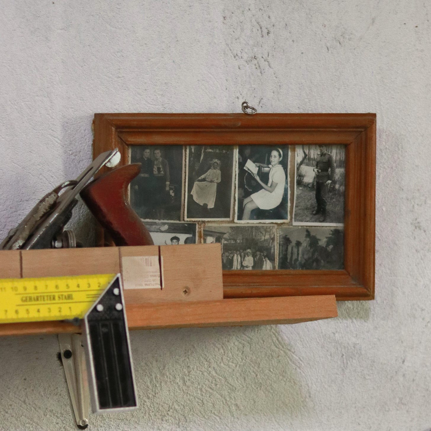 Pe raftul de deasupra bancului de lucru, Ana îmi arată o ramă din lemn care încadrează mai multe fotografii mici, alb-negru.