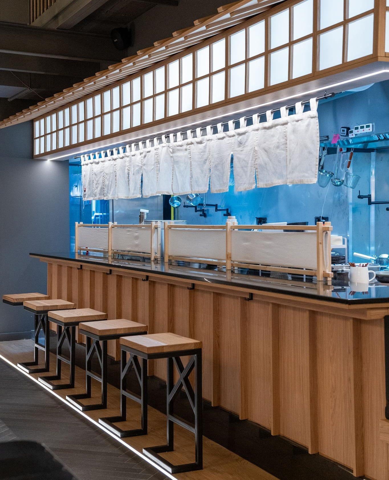 DESIGN: Inspirat de localurile izakaya, spațiul este gândit atât pentru grupuri, cât și pentru cupluri sau oaspeți care vin să mănânce singuri și care pot sta ca la un bar, cu fața către bucătăria deschisă.