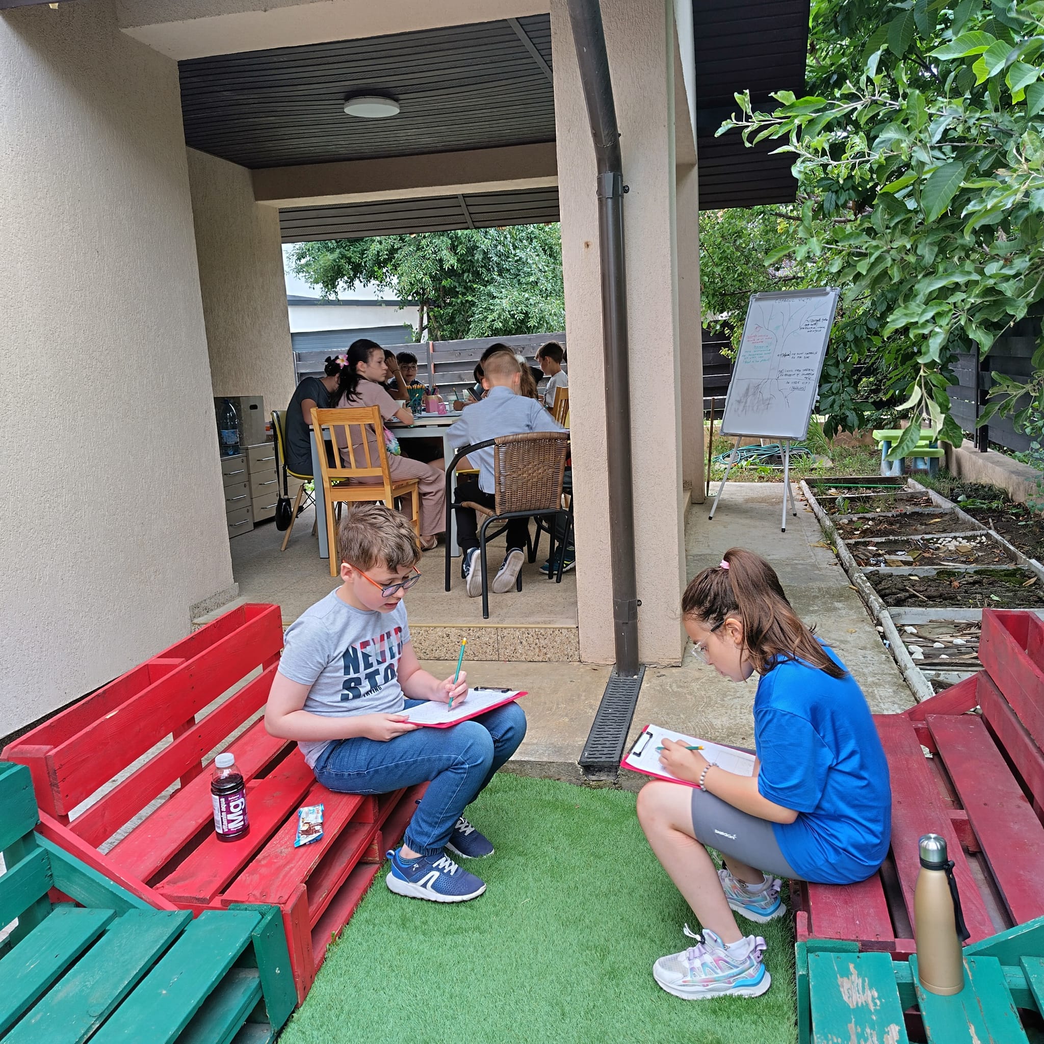 În spațiul comun de la parter, șase măsuțe stau aranjate „în U” pentru discuții de grup, iar în zilele de sărbătoare, când casa se umple, forfota se extinde și la mesele din bucătărie. Pe timp frumos, terasa și umbra copacilor din curte sunt preferate pentru activități.