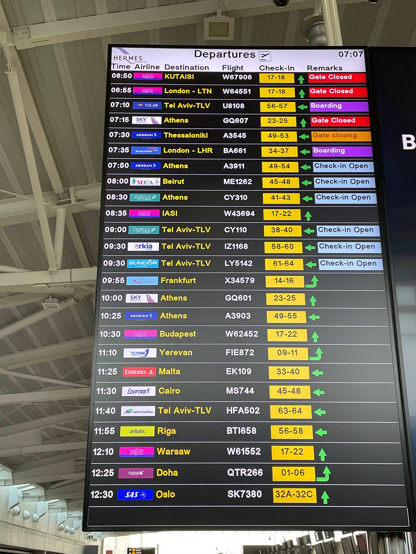 La plecare, am numărat peste 10 companii aeriene care urmau să decoleze din Larnaca. Așa arată tabloul de zboruri al unui aeroport care nu-și pune toate ouăle în același coș.