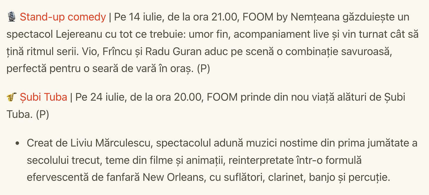 Conținut Sponsorizat - un mesaj de până la 100 de cuvinte, cu link și fotografie, integrat la mijlocul newsletterului de vineri, cu extindere pe Instagram. Exemple: Phinia, FAR, Ven Ven Festival.